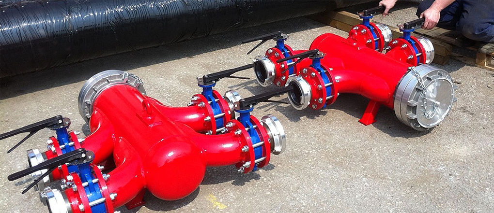 Fuel unloading hose assemblies with high visibility secondary containment cover, floats and breakaway couplings are also available
